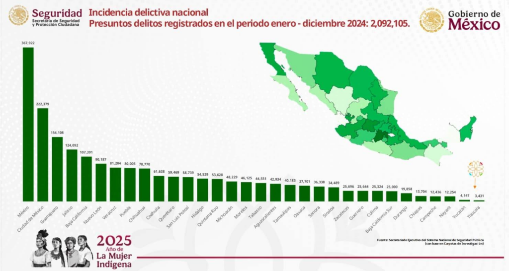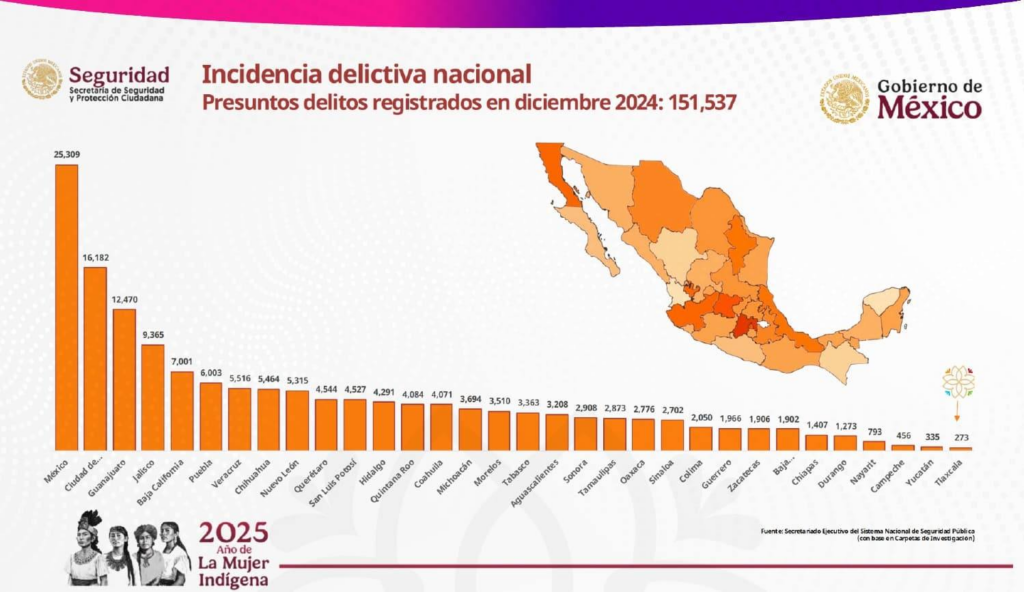 El secretario técnico estatal de la Secretaría de Seguridad y Protección Ciudadana del Gobierno de México, Fernando Nicolás Cuapio Cuapio, resaltó la efectiva coordinación entre los diferentes niveles de gobierno, lo que ha sido crucial para contener y revertir el aumento de la inseguridad. Según las estadísticas, en diciembre de 2024 Tlaxcala registró solo 273 carpetas de investigación, lo que confirma su lugar como el estado con la menor incidencia delictiva en el país.